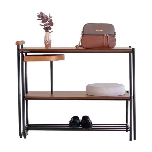 Material: Aparador e banco com estrutura em aço carbono com pintura epoxi na cor preta, MDF com lamina natural cinamomo tingida na cor mel, assento em MDF bege revestido de espuma e tecido. A altura do chão ao assento é de 42cm, onde tem um assento em MDF revestido com espuma em densidade 28D e tecido 100% algodão. Peso: aparador 7,48kg e banco 12,76kg. Produto entregue montado. Capacidade suportada: 110kg. Altura da mesinha: 66cm. Altura do cabideiro: 76cm.